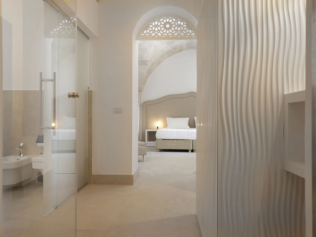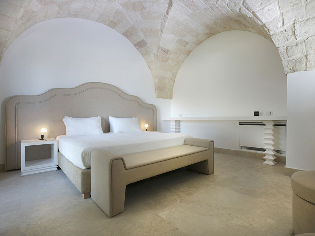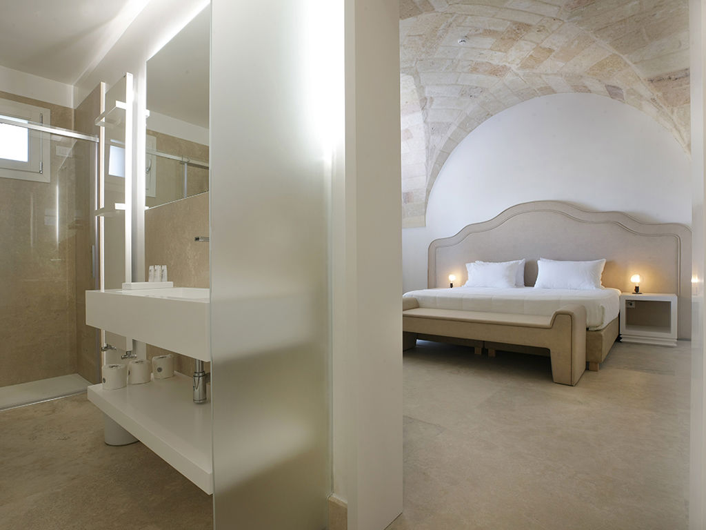 La spaziosa camera Junior può ospitare due adulti. È accessibile dal cortile esterno e presenta un soffitto a volta a crociera. Il letto matrimoniale con materasso in memory foam ha una testiera in pelle dal design esclusivo. Il bagno è dotato di lavabo, doccia e altri comfort.